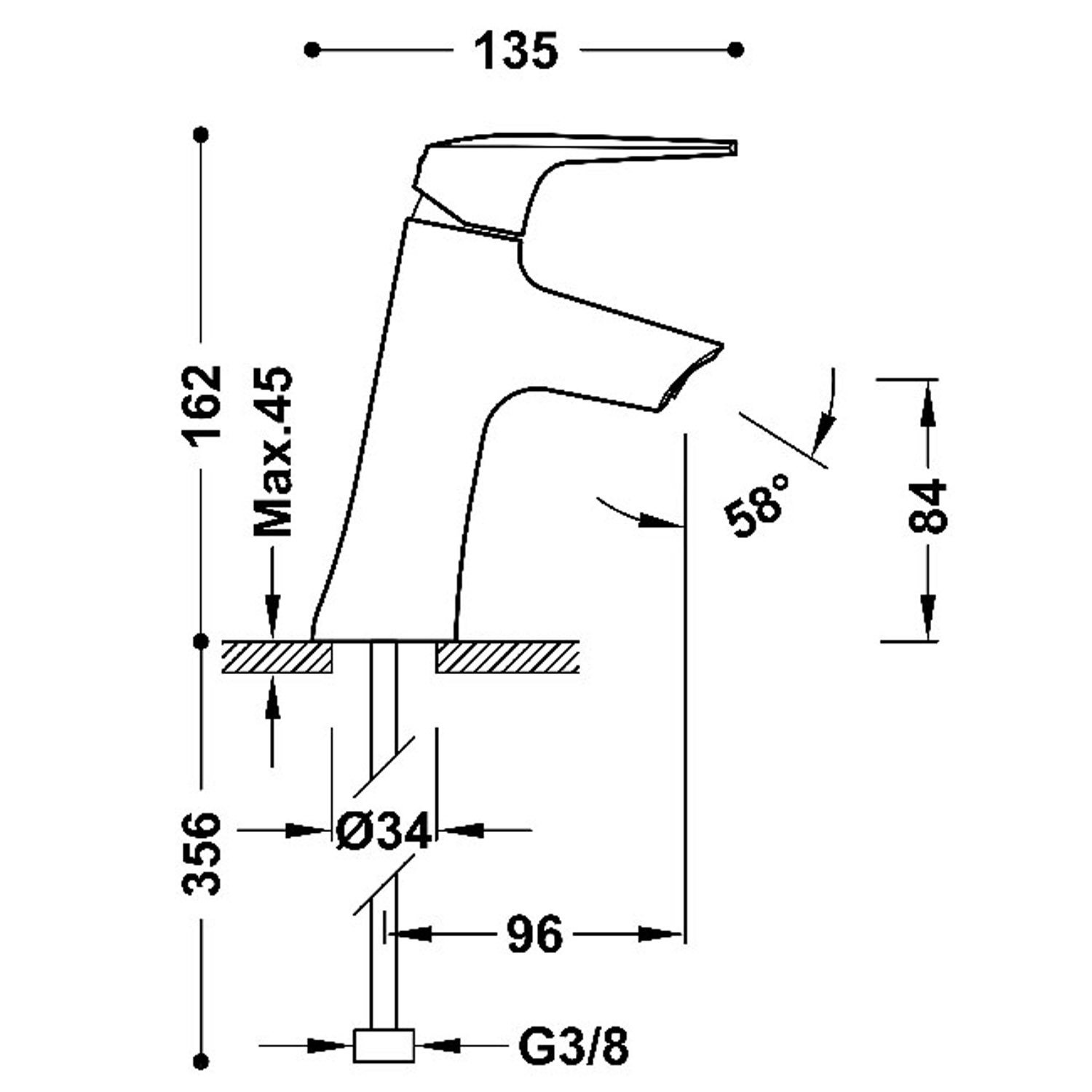 De afmetingen van deze wastafelmengkraan zijn: 16.2 cm lang en 13.5 cm breed. De hoogte van de kraan is 8.4 cm en de kraan loopt onder de wastafel nog 19.4 cm door.