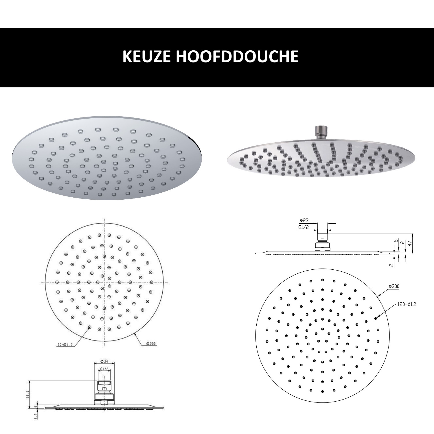 In de set kunt u kiezen uit verschillende regendouches en handdouchehouders. Er zijn verschillen in lengtes en in en vormen: vierkant en rond.