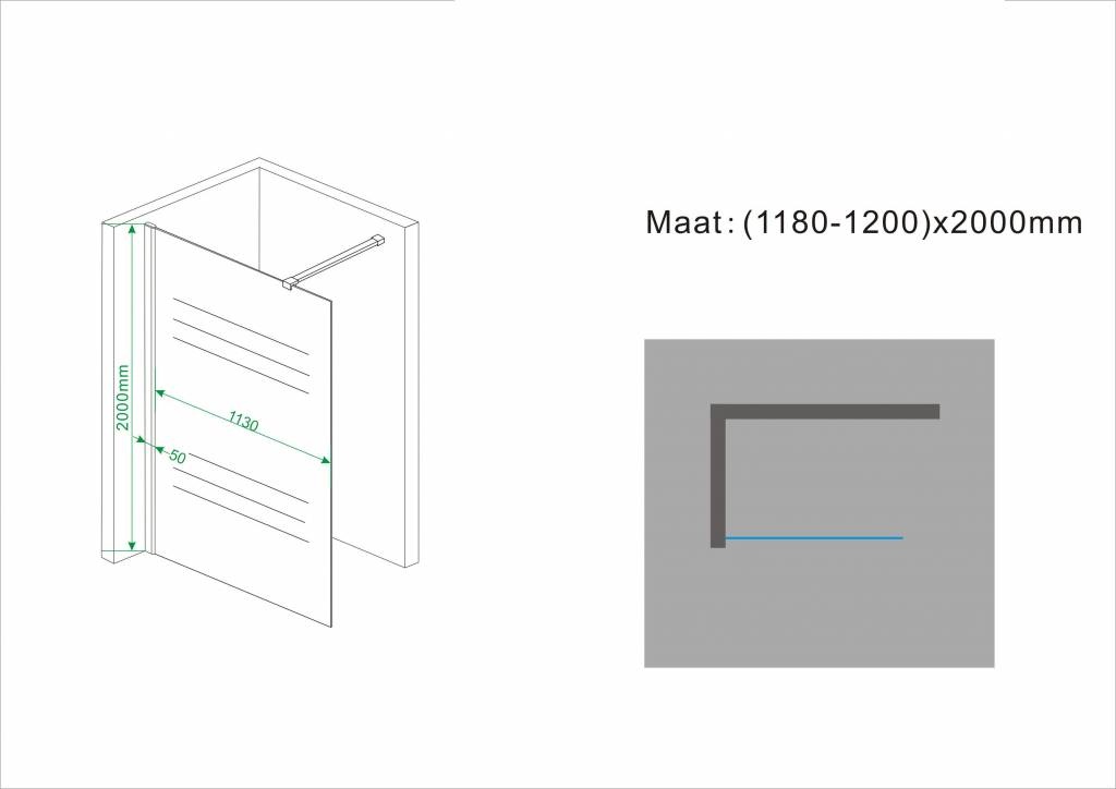 Zeer fraaie Inloopdouche 120cm breed 200cm hoog inclusief chroom zijprofiel en chroom stabilisatiestang van 120cm