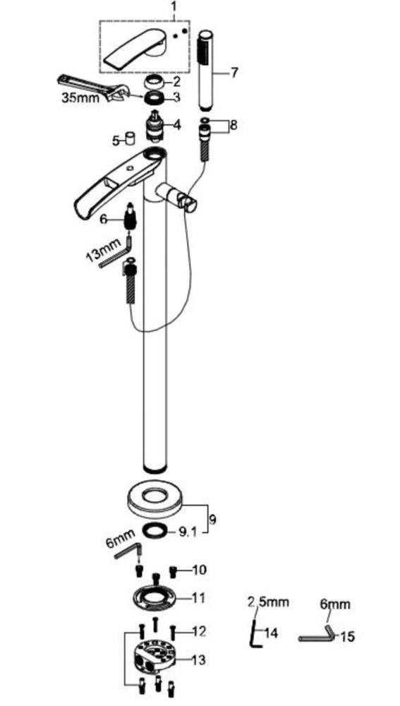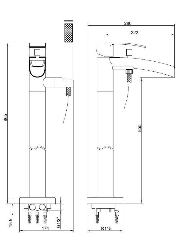 Lima vrijstaande badmengkraan waterval compleet chroom, Messing verchroomde handdouche, Eénhendelmengkraan, Chroom doucheslang, Hoogte : 965 mm, Uitloop hoogte: 855mm, Sprong uitloop: 222mm,