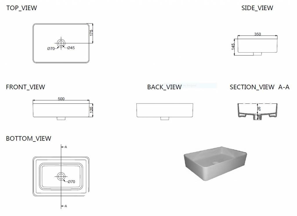 Wiesbaden Link opzetwastafel, Rechthoek , Afmeting: 350x500x145, Kleur: wit, Keramiek,
