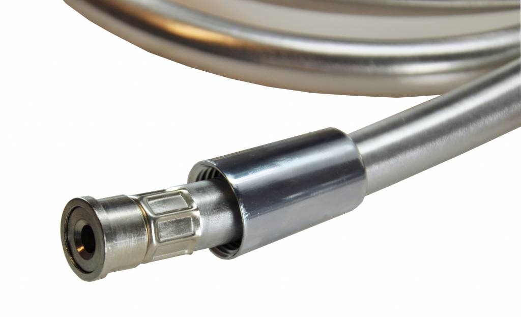 Gladde, versterkte buitenslang voor een goede hygiëne. Messing verchroomde koppeling waarvan één zijde een anti-twist koppeling heeft.