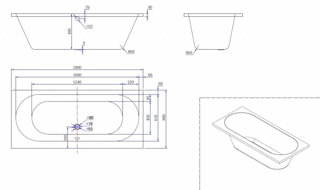 Portus RD inbouw ligbad, 180*80*49 cm, Kleur wit, DUO-bad, 3,5mm acryl, 2 lagen polyester,