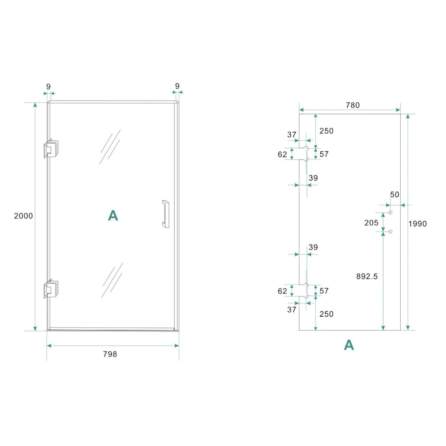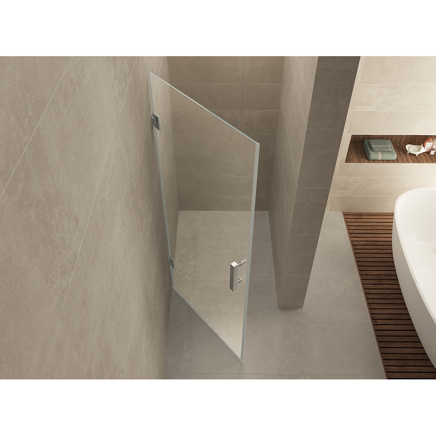 Nisdeur zonder profiel, 800x2000, 8mm NANO glas, Chroom scharnieren, Chroom metalen hendel,