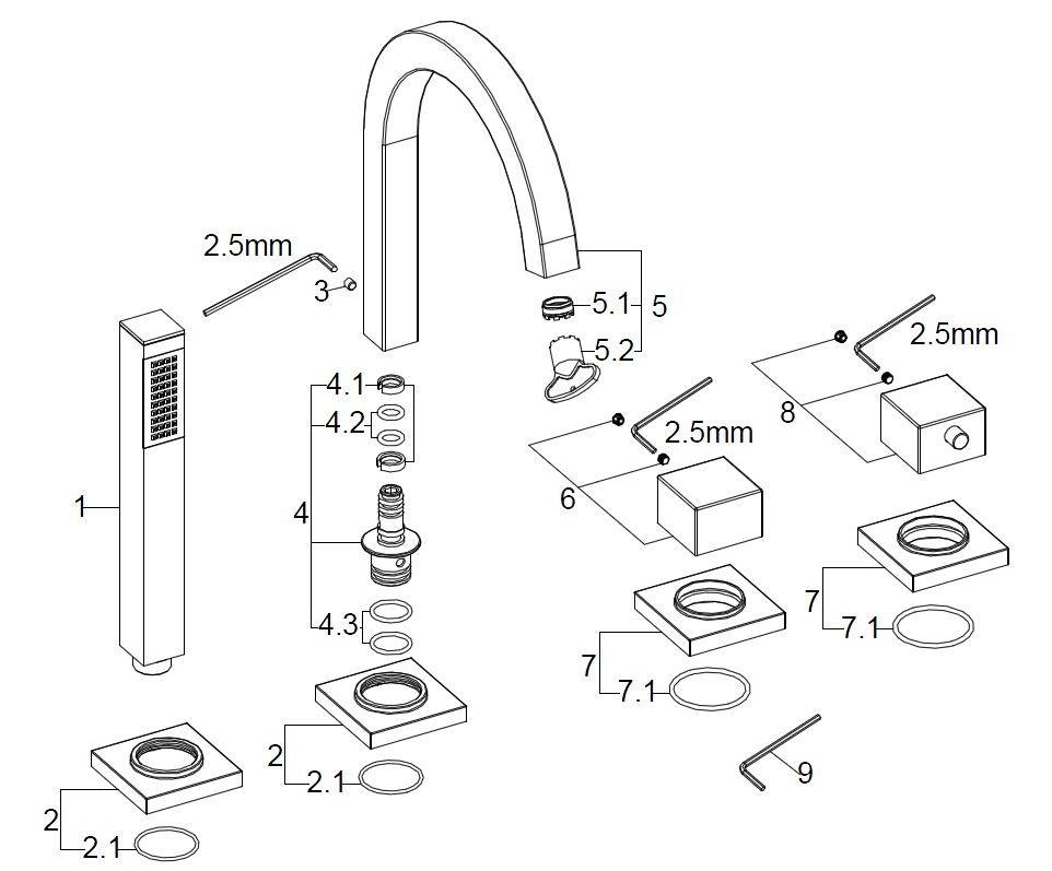 Verzonken vierkante handdouche messing/verchroomd br/> Chroom vierkante omstelknop