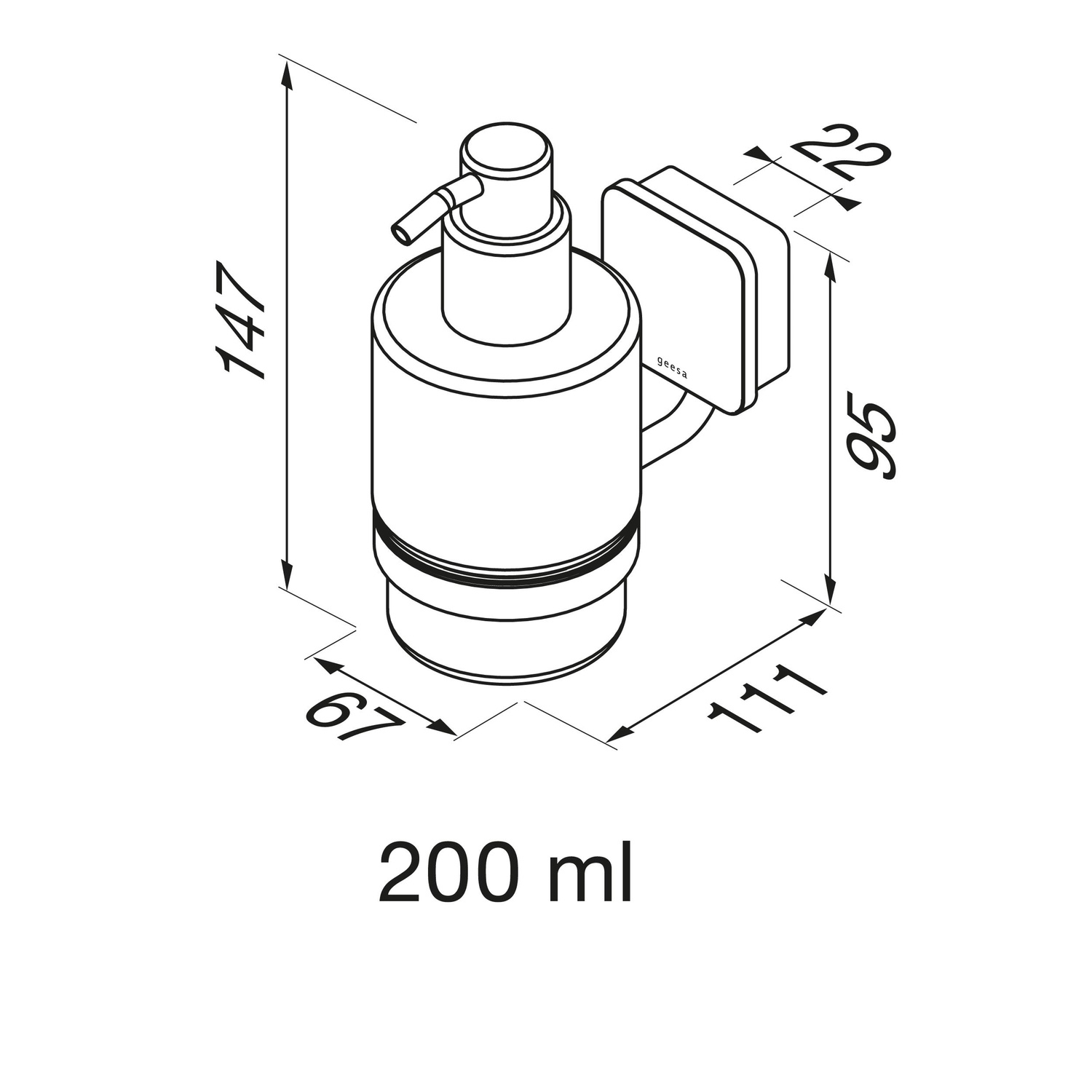 De zeepdispenser met muurbeugel is gemaakt van metaal en wordt aan de muur bevestigd met schroeven. Hij heeft een breedte van 7.5cm, een hoogte van 7.5cm en een diepte van 16cm. Hij heeft een volume van 200ml met een gewicht van 354 gram en is Mat Zwart.
